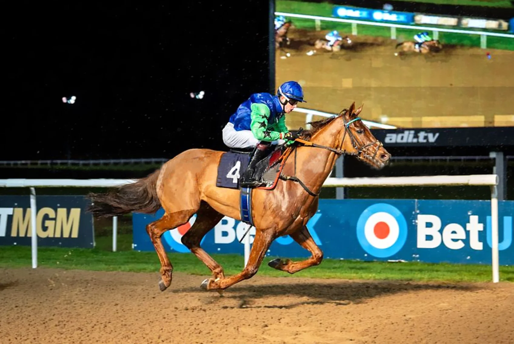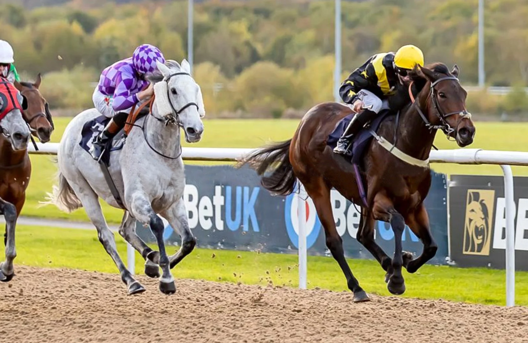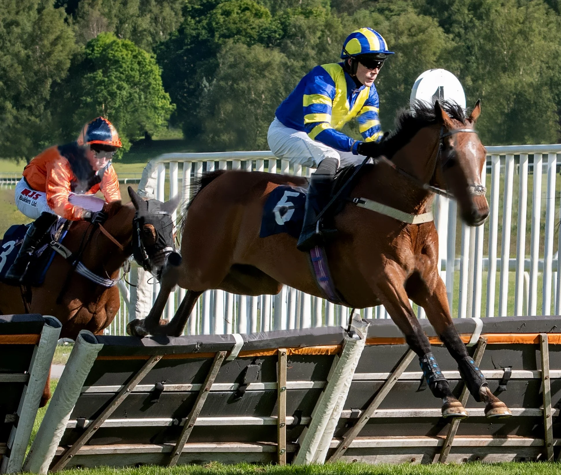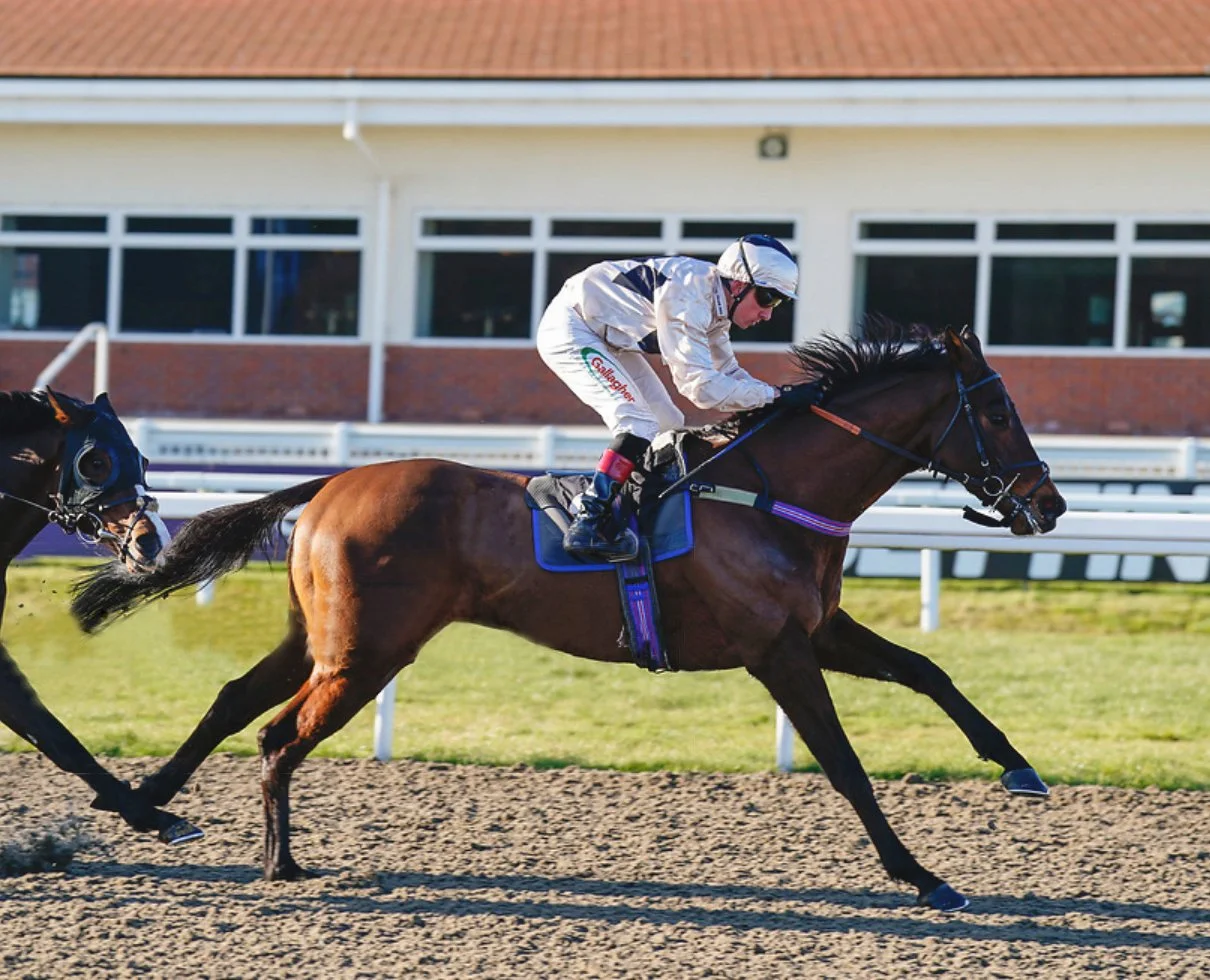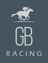 A black background featuring a white silhouette of a horse and rider in racing motion above the letters 'GB' and the word 'RACING' in white.